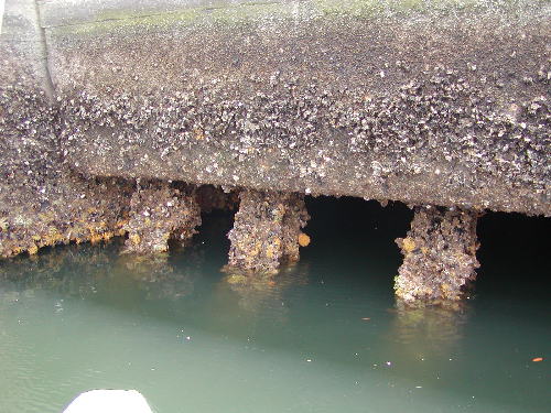 写真の通り波止際や柱にはカキガラや着生物があり落とし込みや竿下のサビキ釣りなどをする場合この柱に注意が必要です。