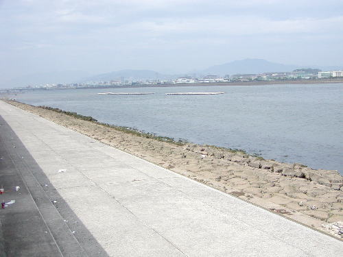 大潮の干潮時は写真中央上の太田川に浮かんでいるカキイカダ辺りまで干潟が出来ます。